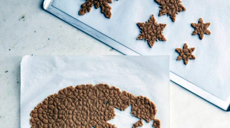 Kalıbın üzerinden merdaneyle geçin. Dantel şeklinin hamurun üzerinde çıkmasını sağlayın.
