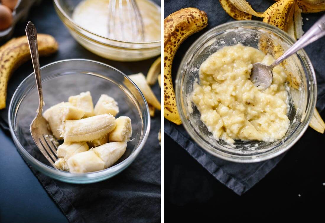 - İki yumurtayı ardı ardına attıktan sonra yoğurt, püre halindeki muzlar ve vanilyayı ekleyip karıştırmaya devam edin.