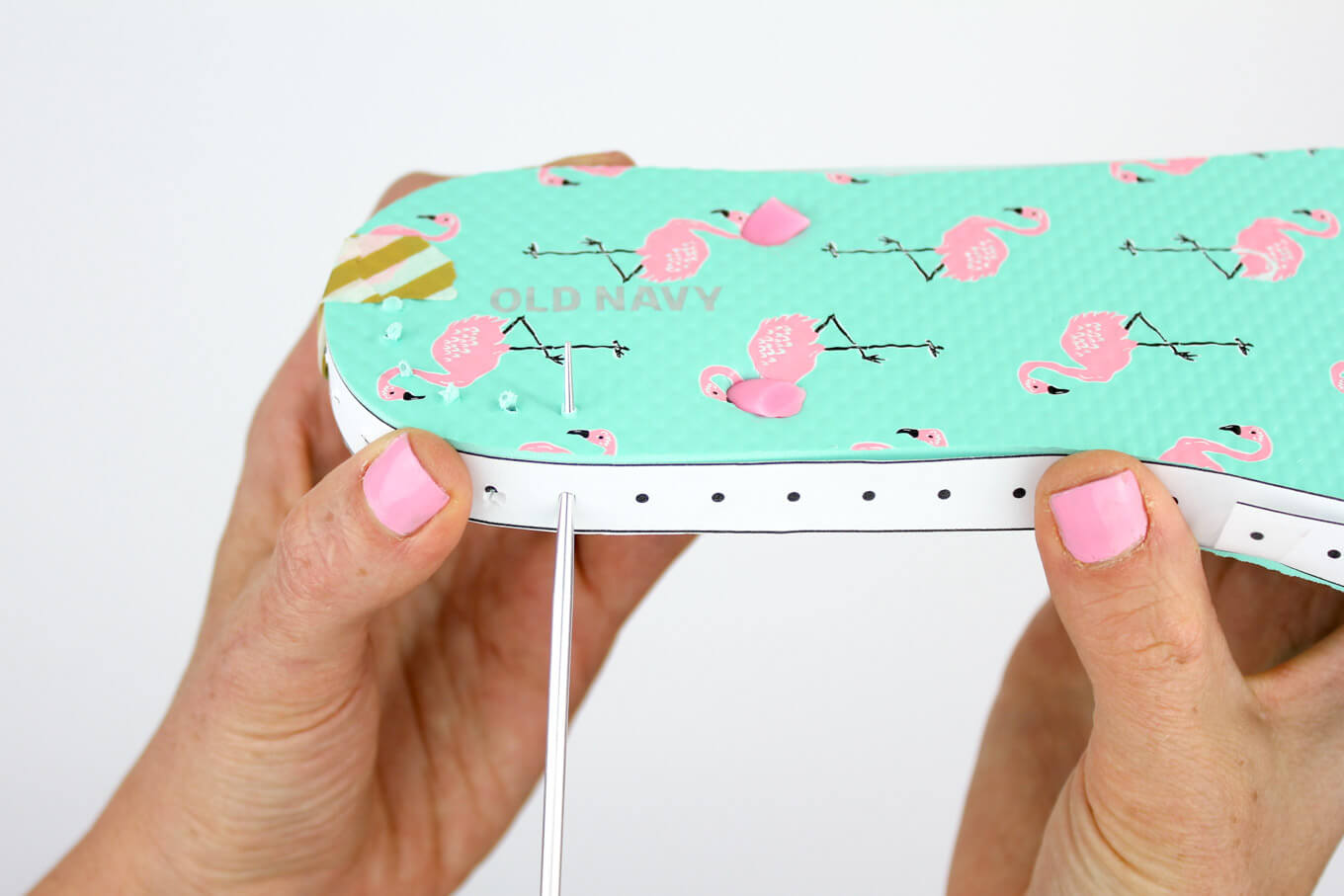 2. Yorgan iğnesiyle terliklerin yan taraflarında delikler açın. Deliklerin birbirine uzaklığının eşit olmasına dikkat edin.